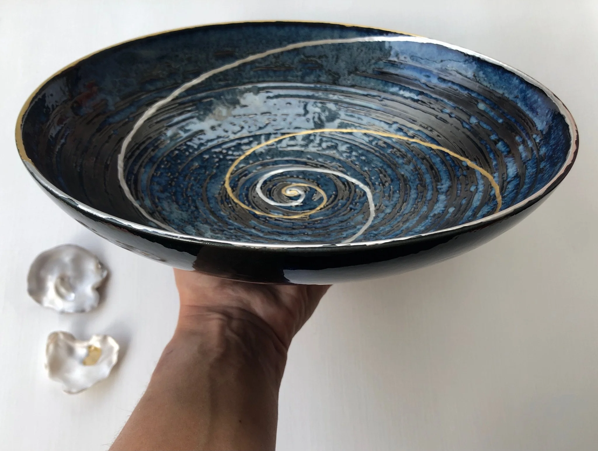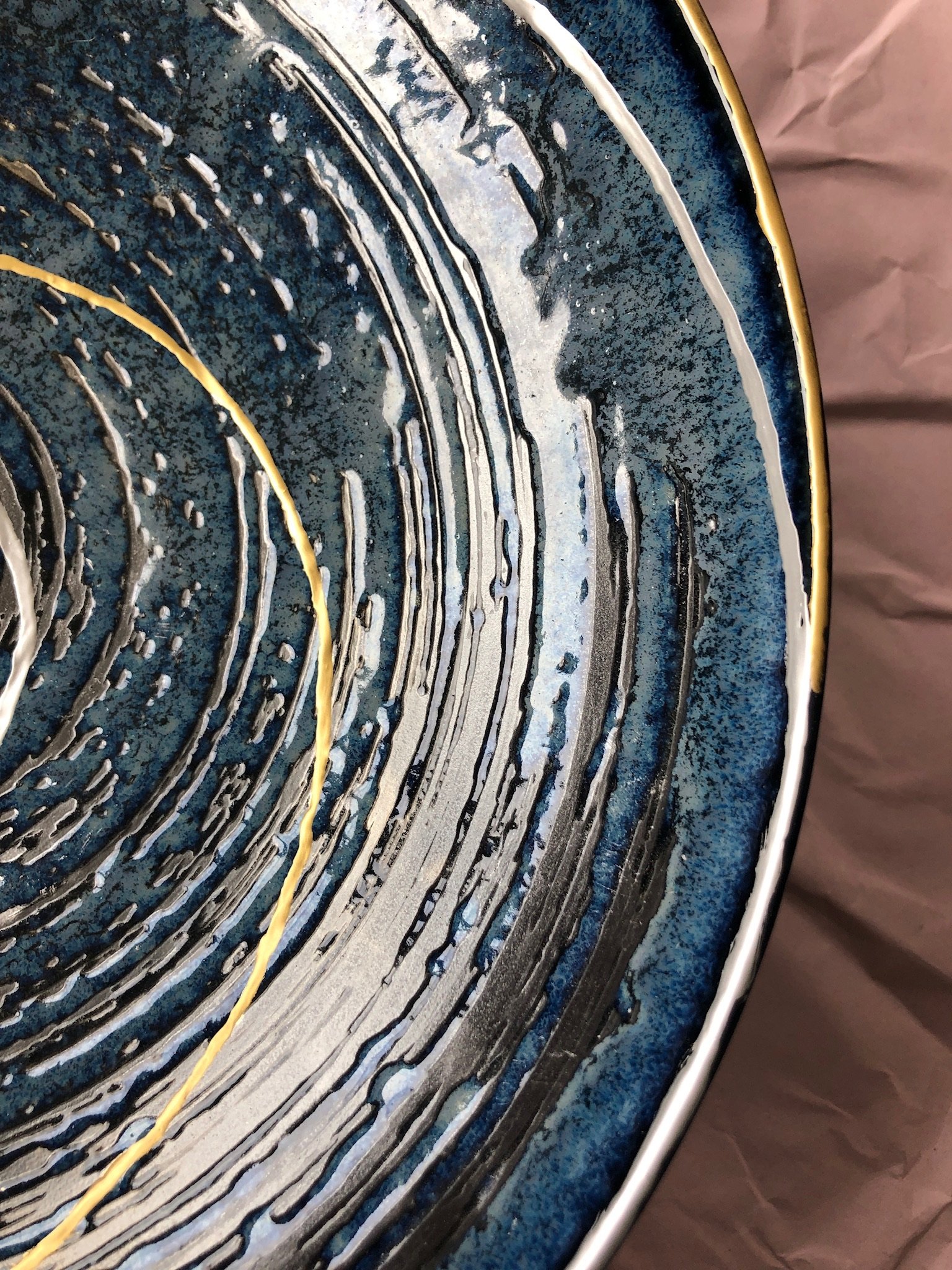 A design based on The Golden Mean was applied using Kintsugi (gold) and Gintsugi (silver) to a serving bowl