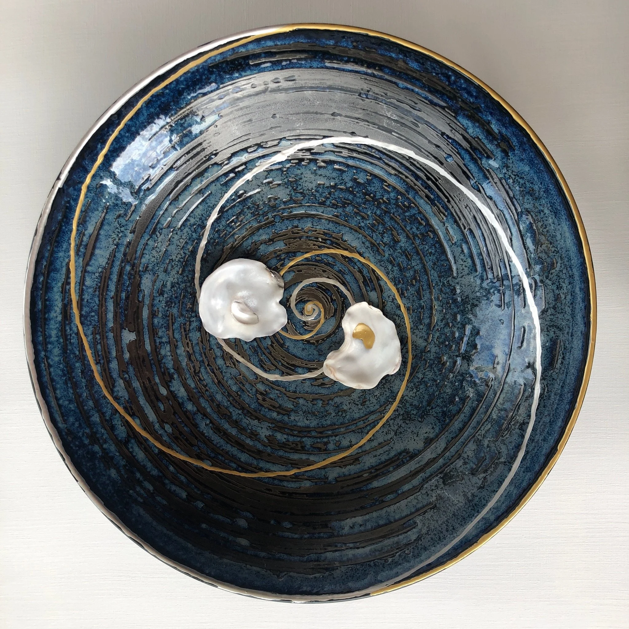In the meantime, I came up with a solution to enhance the serving bowl. And I proposed the following… “It doesn’t seem appropriate to me to break the bowl, but I can embellish it using the traditional kintsugi/gintsugi method of highlighting using urushi lacquer and fine metal powder. I propose taking the design from the golden mean / golden section / divine proportion that exists everywhere in nature. Two lines of different elements, one gold (kintsugi) and one silver (gintsugi), enter from opposite sides of the vessel and trace a perfect spiral and meet in the centre.”