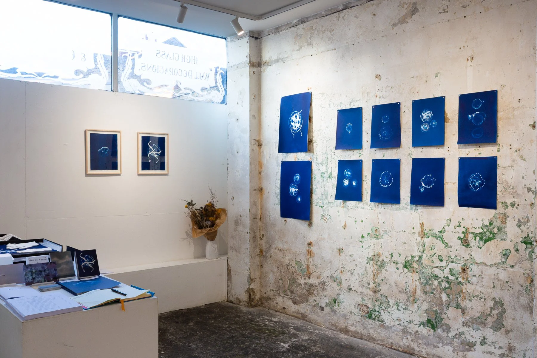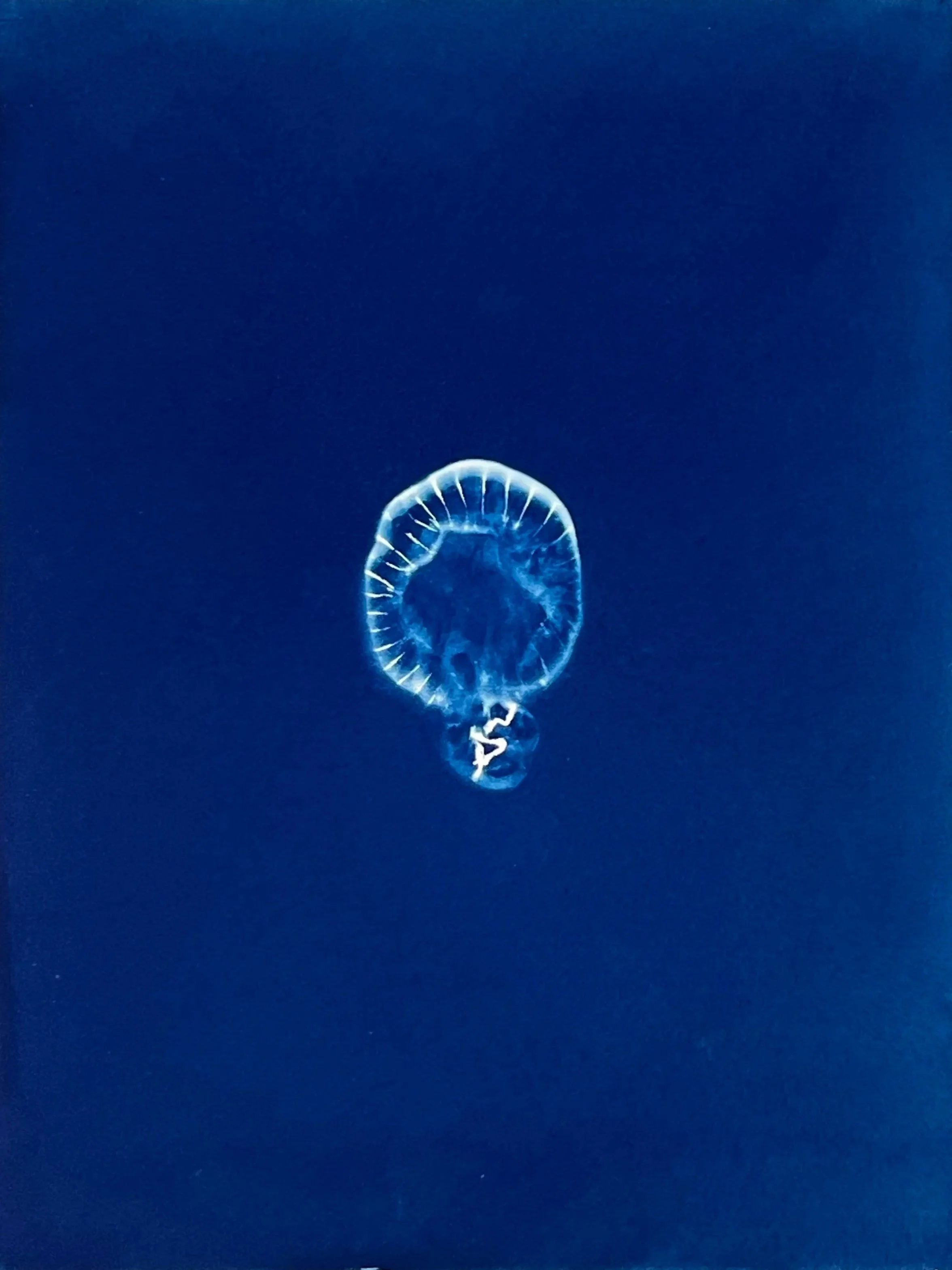 For Float, Elizabeth presents a series of cyanotypes made from jellyfish found washed up along her local shoreline. During the summer of ‘25, she regularly combed the beaches, searching for these ethereal seasonal visitors left behind by the tide. Each jellyfish was carefully collected and used to create a unique photogram, its fragile form preserved through sunlight, iron salts and time. The resulting works hold the trace of a once-living body, transformed into luminous blue shadows on paper. The jellyfish stand as emblems of fragility and endurance, reminders of the shifting balance between life, loss and the sea’s continual motion.